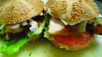 - Fines tranches de poulet grillé, marinées aux herbes douces, déposées sur un pain artisanal légèrement croustillant