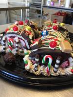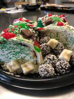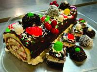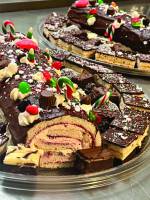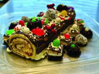 - Bûche de Noël généreusement décorée, farcie à la confiture de petits fruits, crème au beurre vanillée, caramel à l'érable, ganache au chocolat noir, et garnie de mignardises